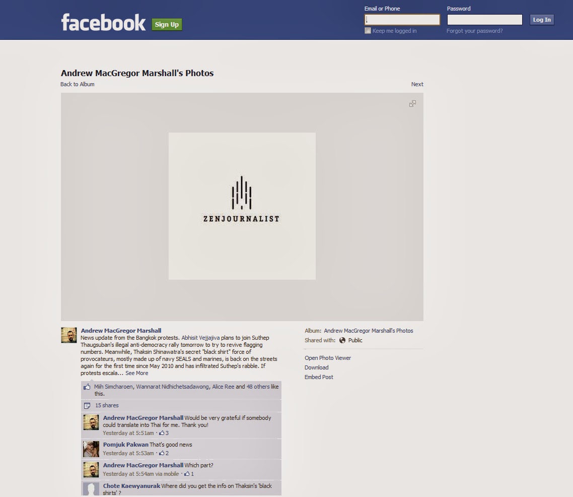 Thaksin Shinawatra's lobbyist Robert Amsterdam has hired former Reuters journalist, now discredited pen for hire, Andrew McGregor Marshall for a now multi-year propaganda campaign aimed against Thailand, its sovereignty, and its institutions. It was Andrew Marshall who suspiciously revealed the regime's intentionally leaked "plans" to mass murder protesters, police and bystanders in a Facebook post titled, "News Update From the Bangkok Protests" which read: