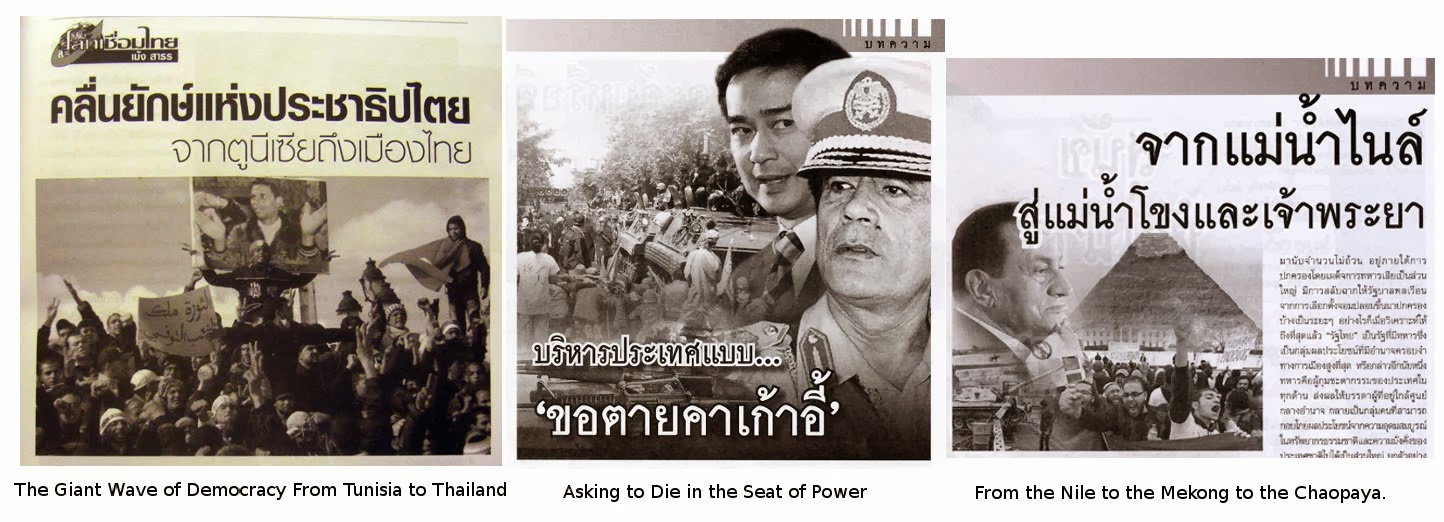 Image: From Thaksin Shinawatra's "red" publications, left to right - "The Giant Wave of Democracy From Tunisia to Thailand," "Asking to Die in the Seat of Power," and "From the Nile to the Mekong, to the Chaopaya," all indicate that Thaksin's propagandists were likewise channeling the US State Department's "Arab Spring" rhetoric as well as making the implicit threat that armed militancy was (and may still be) a desired option.